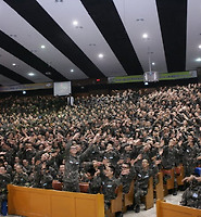 인원파악 후 애국가, 조국기도문 낭독, 도수체조, 전방을 향해 힘찬 함성 5초
